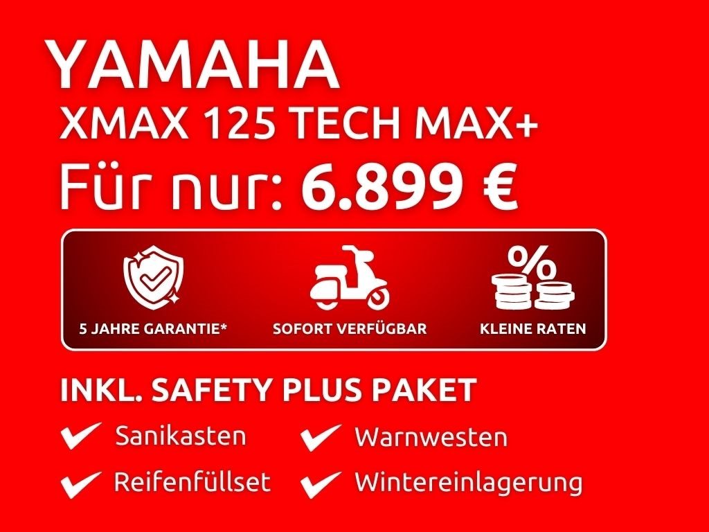 - Änderungen, Zwischenverkauf und Irrtümer vorbehalten. Zu seiner High-End-Ausstattung gehört eine elektrisch einstellbare Verkleidungsscheibe für einen ultimativen Windschutz. Das TFT-Cockpit bietet volle Konnektivität, sodass Du über dein Smartphone auf die kostenlose Garmin-Navigation* zugreifen und Anrufe, Nachrichten, Musik und vieles mehr abrufen kannst. Spezielle Tech MAX Farben mit exklusiven Verkleidungsmerkmalen unterstreichen das High-End-Image zusätzlich. (* Die Navigations-App ist in manchen Ländern nicht erhältlich. Informationen zu Tempolimits, Verkehrslage usw. werden in einigen Ländern und Regionen nicht bereitgestellt. Außerdem werden Daten zu Geschwindigkeitsbegrenzungen möglicherweise nicht zeitnah aktualisiert, und Geschwindigkeitsbegrenzungen können sich je nach Tageszeit ändern, z. B. in der Nähe von Schulen oder Baustellen.) Die dynamische Sportverkleidung mit Voll-LED-Beleuchtung sorgt dafür, dass der XMAX 125 Tech MAX+ aus der Masse heraussticht. Sein gutes Aussehen wird durch funktionale Merkmale wie den Stauraum für zwei Helme* unter der Sitzbank, einen kraftstoffsparenden Start-Stopp-System, eine schlüssellose Bedienung per Smart Key und eine USB Typ C-Buchse ergänzt. (*Abhängig von ihrer Größe und Form.)